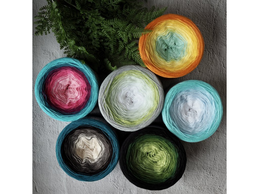Luxusní, ručně vyrobené duhové klubíčko s jemnými přechody, ze kterého vzniknou lehké a vzdušné modely bez zbytečného sešívání. Délka 1500 m znamená jedno klubko pro velký šátek, šaty, sukni nebo třeba deku do kočárku.