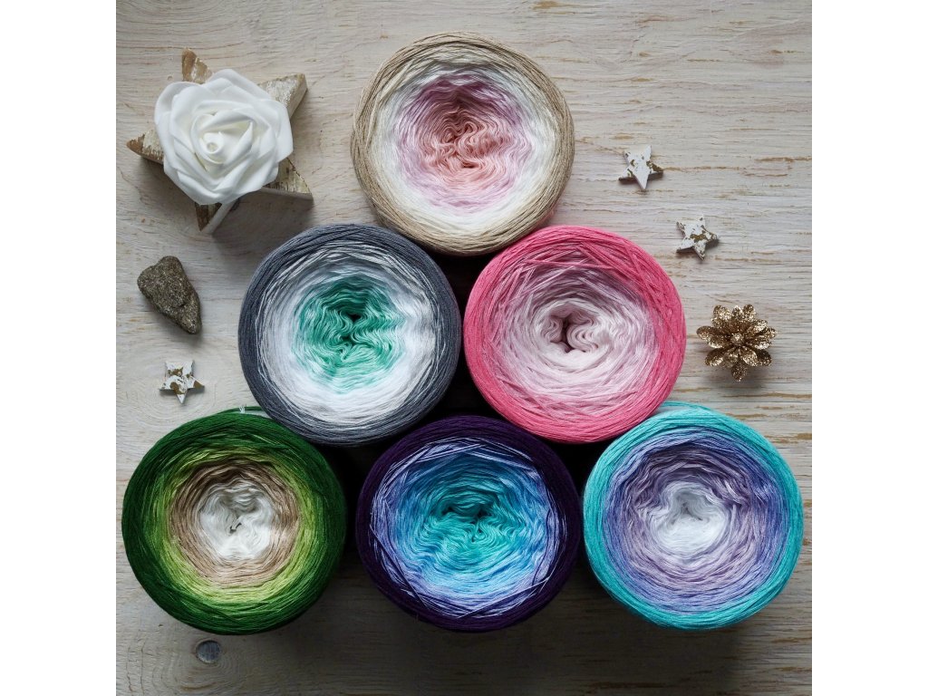 Luxusní, ručně vyrobené duhové klubíčko s jemnými přechody, ze kterého vzniknou lehké a vzdušné modely bez zbytečného sešívání. Délka 1500 m znamená jedno klubko pro velký šátek, šaty, sukni nebo třeba deku do kočárku.