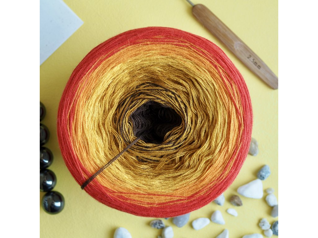 Luxusní, ručně vyrobené duhové klubíčko s jemnými přechody, ze kterého vzniknou lehké a vzdušné modely bez zbytečného sešívání. Délka 1500 m znamená jedno klubko pro velký šátek, šaty, sukni nebo třeba deku do kočárku.