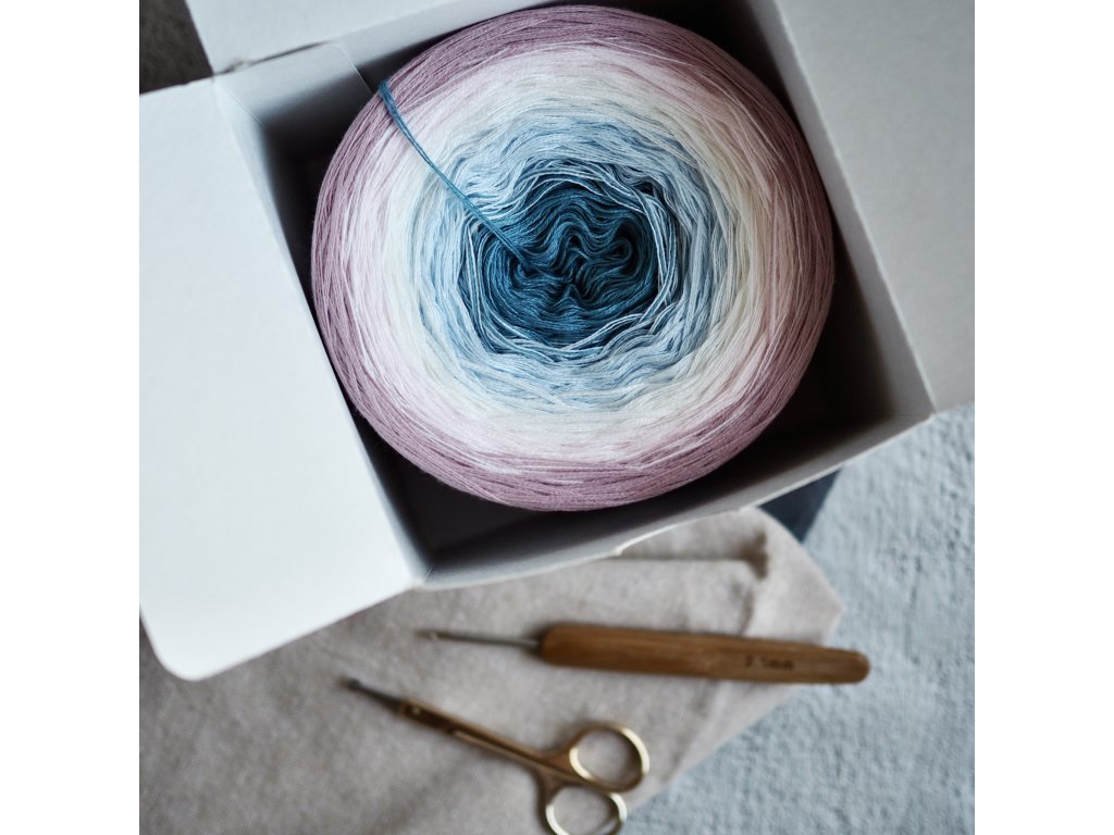 Luxusní, ručně vyrobené duhové klubíčko s jemnými přechody, ze kterého vzniknou lehké a vzdušné modely bez zbytečného sešívání. Délka 1500 m znamená jedno klubko pro velký šátek, šaty, sukni nebo třeba deku do kočárku.