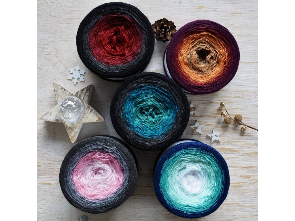 • Volitelný lurex – zlatý, stříbrný nebo tajemná třpytivá nitka v hlavní barvě klubíčka.