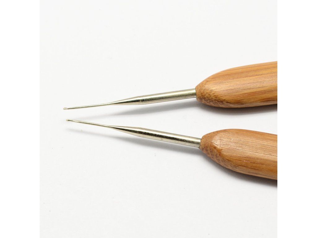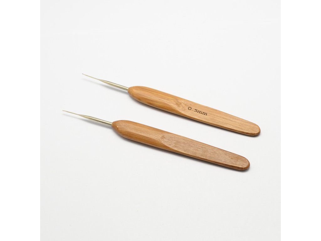 Háček o velikosti 0,5mm, s bambusovou rukojetí. Délka háčku je 13,5 cm a je ideálním pomocníkem při háčkování s tenkými přízemi, třeba na vánoční ozdoby a korálkové šperky.