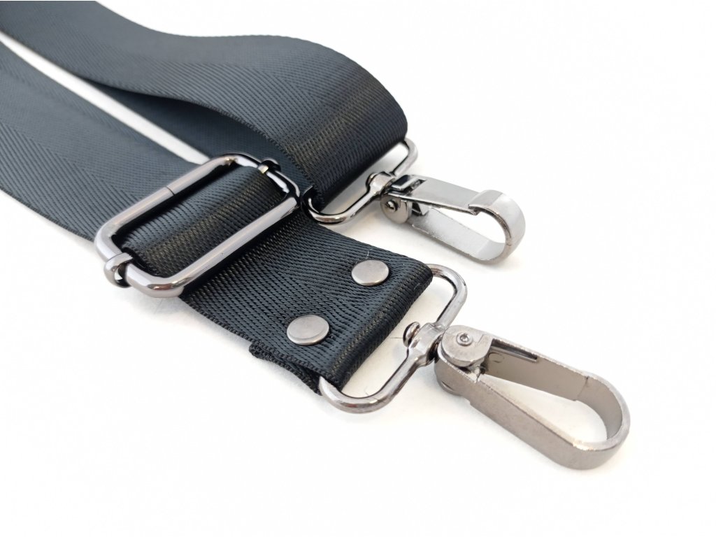 Nastavitelný ramenní popruh má krásný moderní design a je doplněný o kovové karabinky a posuvník.