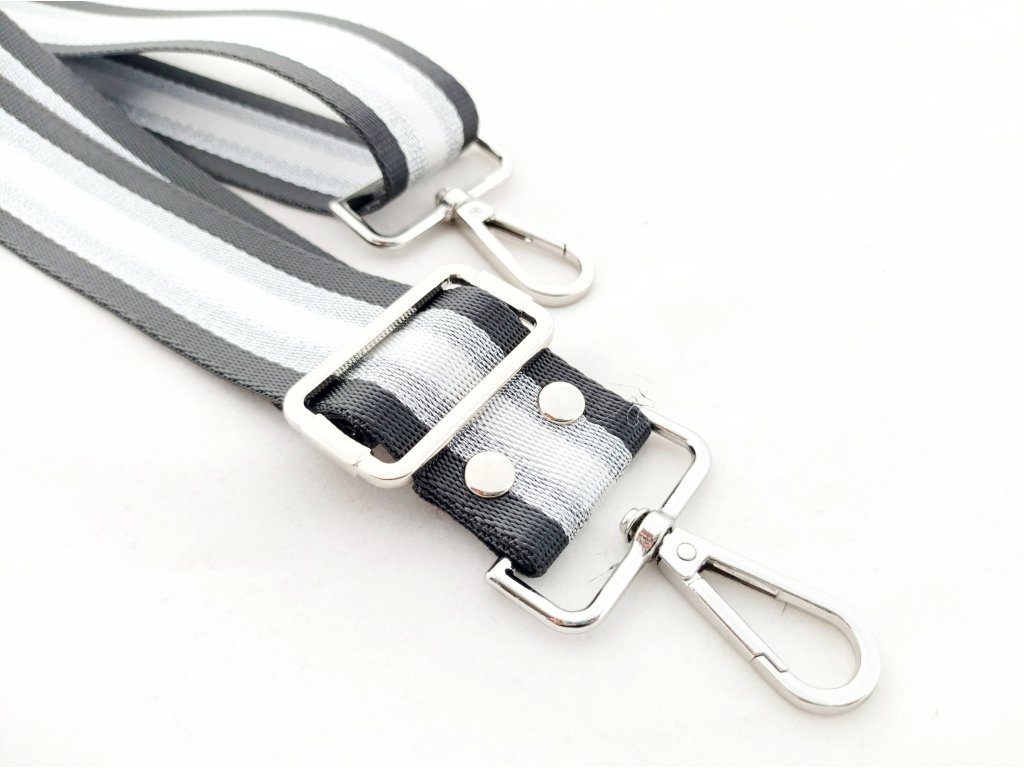 Nastavitelný ramenní popruh má krásný moderní design a je doplněný o kovové karabinky a posuvník.